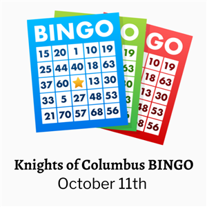 OLP Knights of Columbus are hosting a BINGO to help support their many works in the parish and community on Saturday, October 11th at the JPT Event Center, 2319 W. 38th St. Tickets are $30 and can be purchased at Masses on the weekend or stop by the church office. Doors open at Noon and Bingo starts at 1:00pm